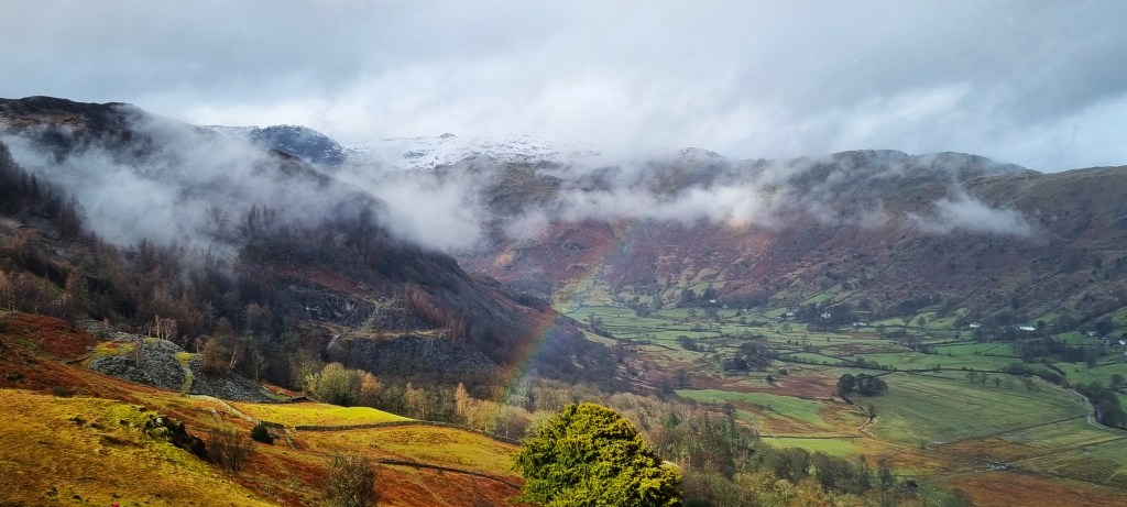 As we descended towards Elterwater on the floor of the valley, we saw small shafts of sunlight breaking through the clouds and, eventually, a rainbow.