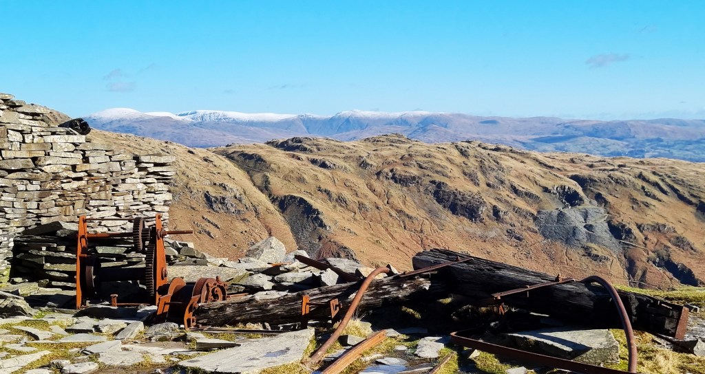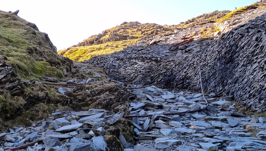 As we gained height, we could see more of Coniston Water, glinting in the sunlight below. Soon, the path was littered with pieces of slate, occasional iron hawsers draped randomly across.
