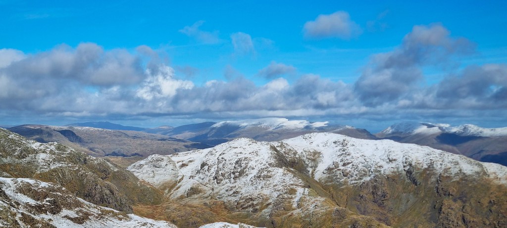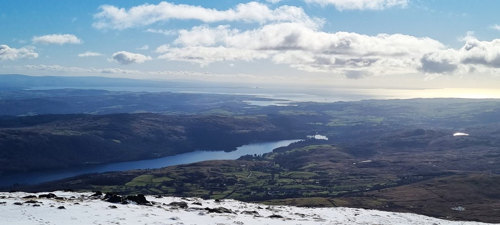 To the south we could see Morecambe Bay in the distance, beyond the northernmost tip of Coniston Water. To the north, the snow-capped fells stretched away under blue sky, interspersed with ridges of light cloud.