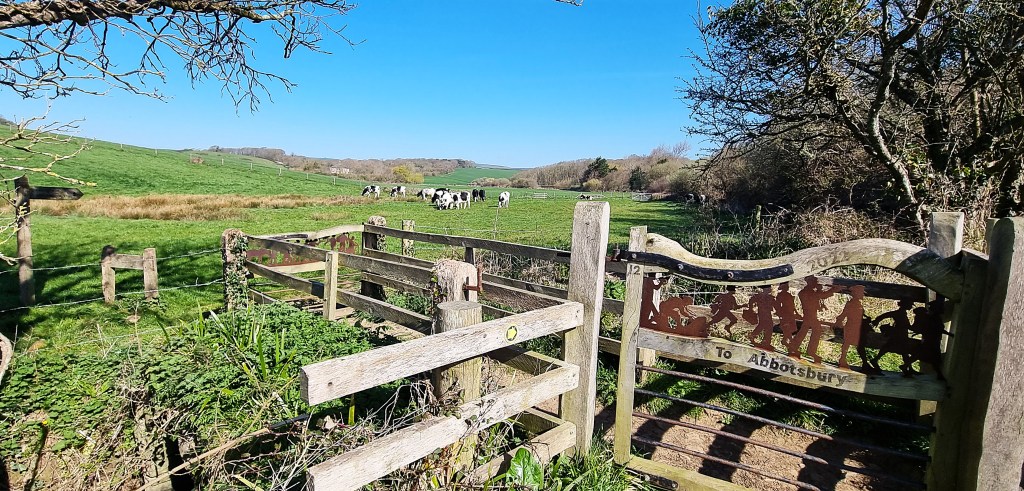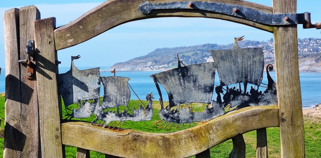 We passed through this ornate field gate, part of the West Dorset Walkers Welcome project, commemorating the landfall of Danish Viking ships on Charmouth Beach in 836.