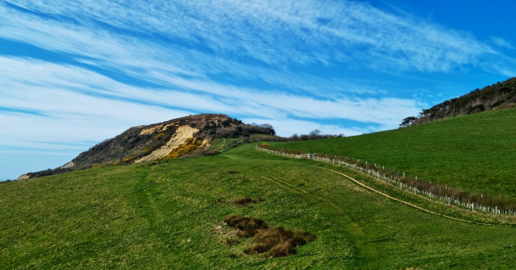 It was a beautifully fresh, sunny morning as we began our ascent behind the beach, heading in the direction of Stonebarrow Hill, above the cliff face known as Cain’s Folly (derivation uncertain).