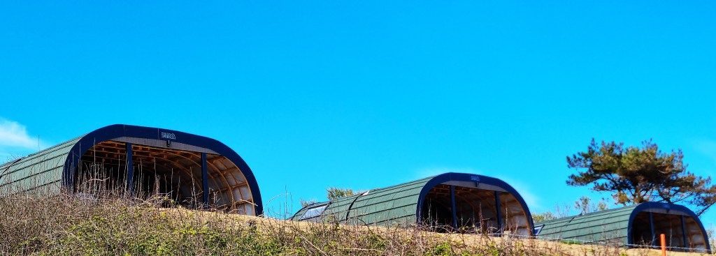 Passing Eype Beach Holiday Park, I admired a row of three ‘glamping pods’ that resemble a military installation. We climbed past an upturned rowing boat and a brick-built pill-box, soon finding many more pods at Highlands End Holiday Park.