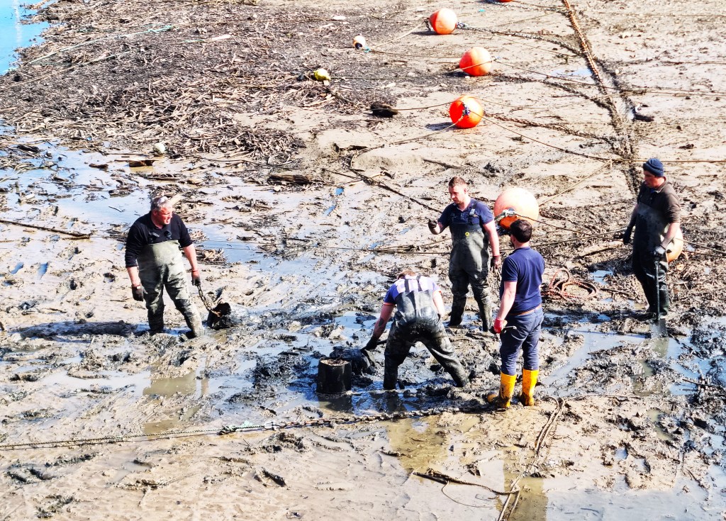 Soon we had reached the outskirts of West Bay. The beach was fairly quiet, but the quayside round the harbour was heaving. A traffic jam of day trippers dawdled slowly round the margin while a bunch of men in wellington boots and waders dug about purposefully in the harbour mud below.