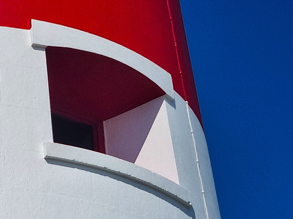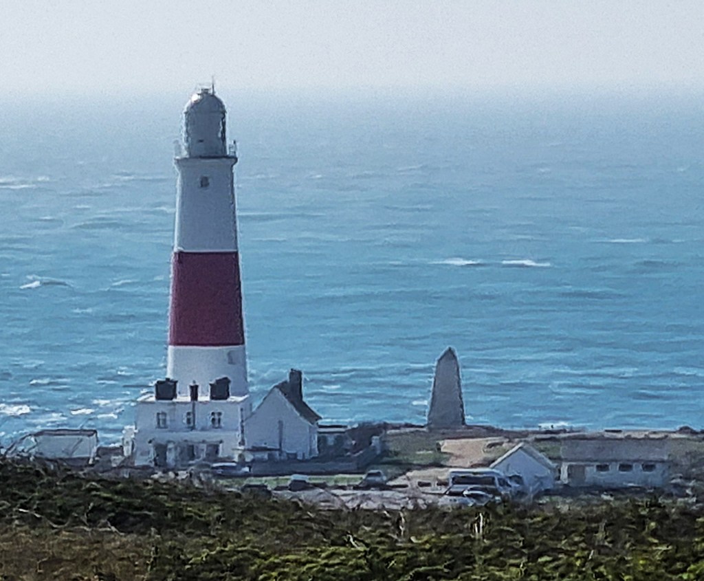 From beside the National Coastwatch lookout there is a clear view of the current Lighthouse itself, its stark red stripe vivid against the dim blue haze of sea and sky.