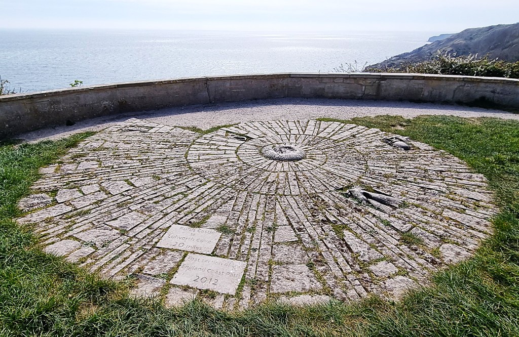 The top of the climb out of Church Ope Cove is marked by a large stone ammonite dug into the earth. It commemorates the opening of the first section of the King Charles III England Coast Path in 2012. This runs the 20 miles from Rufus Castle to Lulworth Cove.