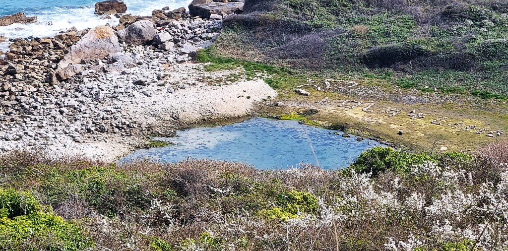 We progressed through a series of abandoned quarries, eventually climbing up to the road near Cheyne House, overlooking Freshwater Bay.