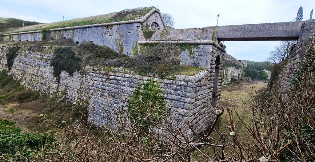 It flirts briefly with the former RAF Portland, now hosting a community farm and unofficial campsite, before reaching the entrance to the Verne Citadel, built between 1857 and 1881 to defend Portland Harbour. This is surrounded, on its southern and western sides, by a huge ditch, some 20 metres deep and 40 metres wide.