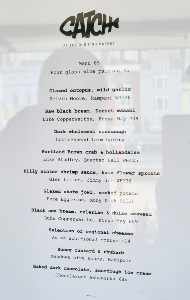 On this final evening our celebratory dinner was provided by Catch: a fish-based tasting menu with paired wines and optional cheese. It was a bit too piscatorial for me, but I enjoyed it nevertheless.