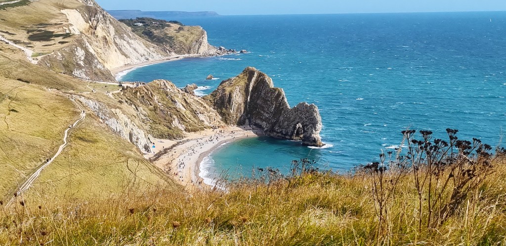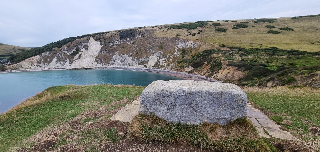 Having waited for a party to pass in the opposite direction, we took possession of a stone bench overlooking the beautiful limestone cliffs ahead, the top of Durdle Door just visible.