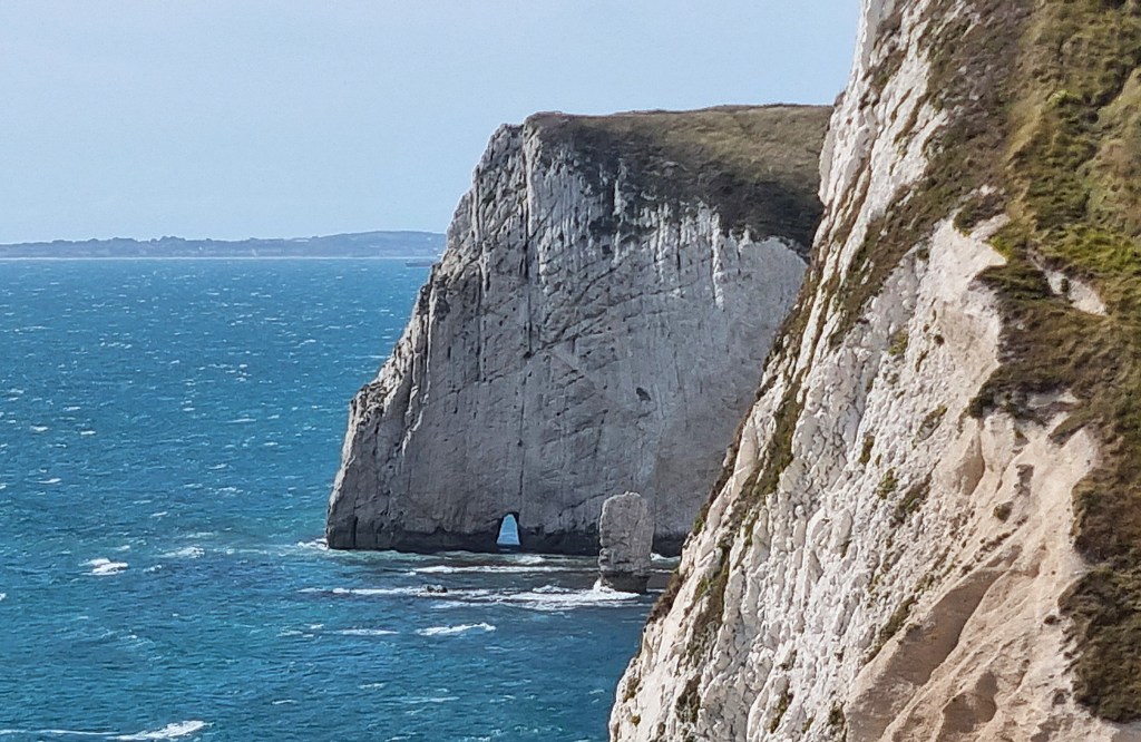 We continued above Bat’s Head, which contains Bat’s Hole, a kind of miniature Durdle Door in whiter limestone, with the sea stack known as Butter Rock adjacent.