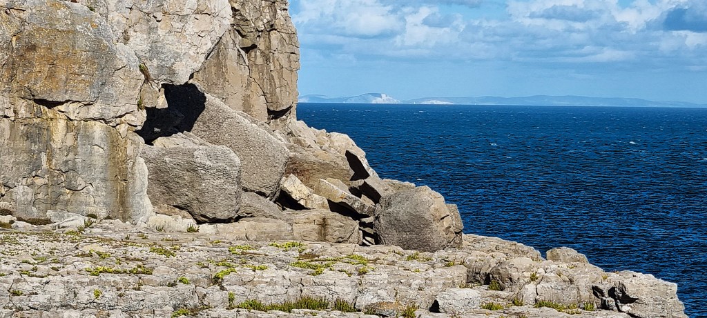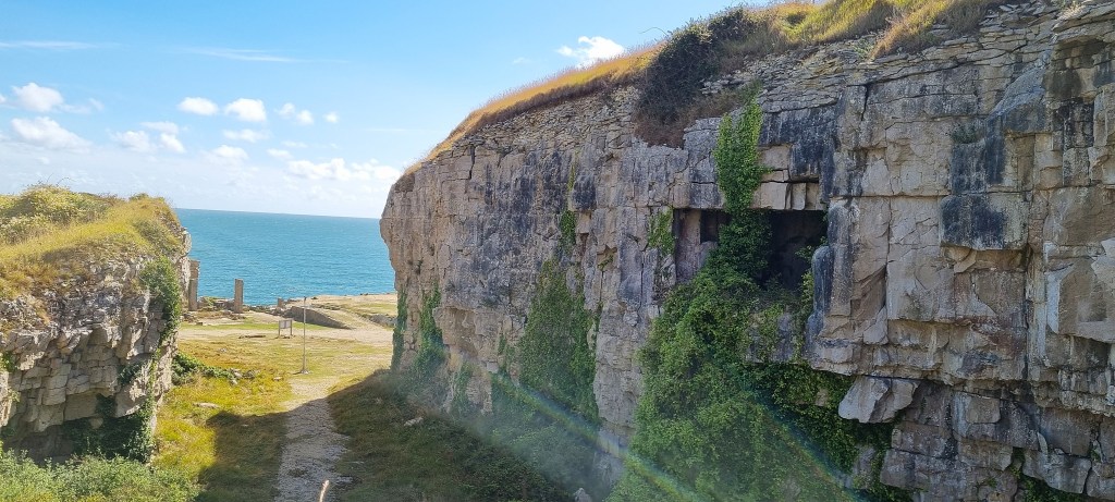 Next in the sequence is Dancing Ledge, where quarrying ended in 1914. Small ships could moor off the ledge, and stone from here was transported by that means to build Ramsgate Harbour.