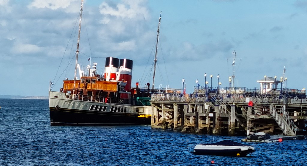 We made our way past these various attractions, following the newish Coast Path signage into a shady walkway surrounded by trees. Emerging on to the villa-lined roads built by Burt, we walked across the grass to the end of Peveril Point, then past the Wellington Tower and the Pier, where Waverley was now moored.