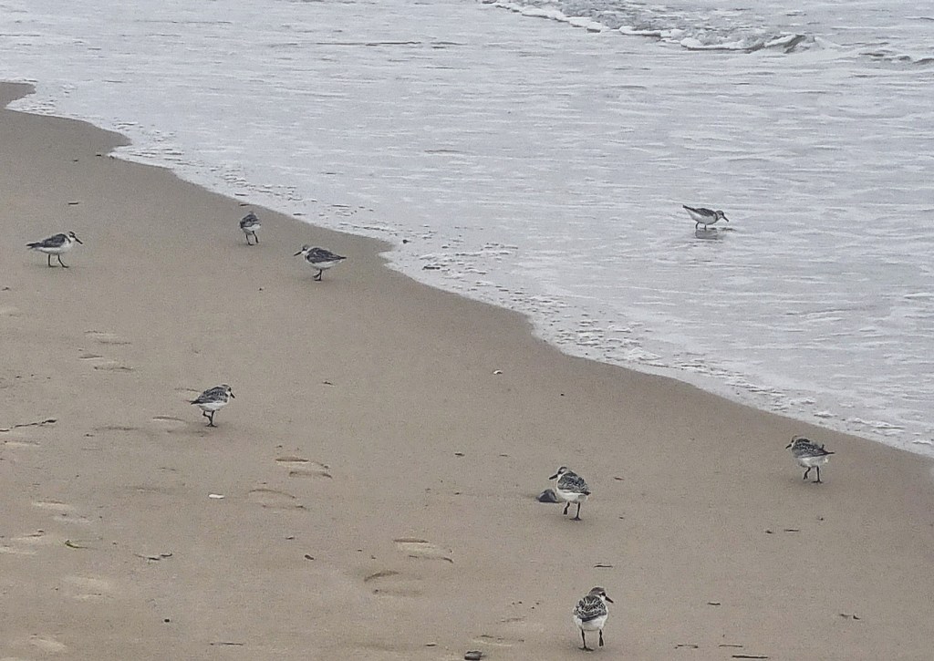 It was a heavy shower, so we waited for it to stop before taking to Knoll Beach and Shell Bay for the final push. There were very few people on the beach, apart from a few dog walkers. Light drizzle resumed as we interrupted a small group of waders investigating the seaweed.