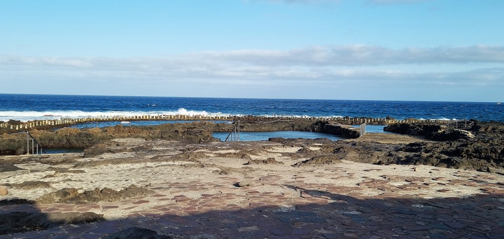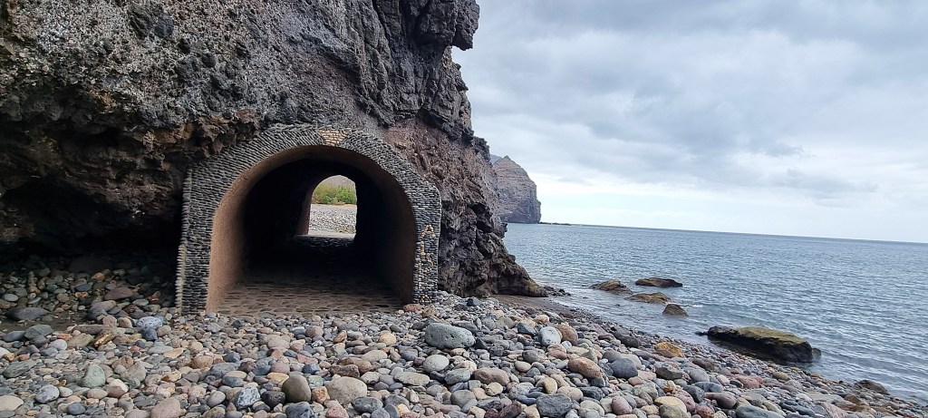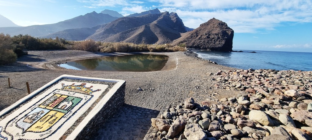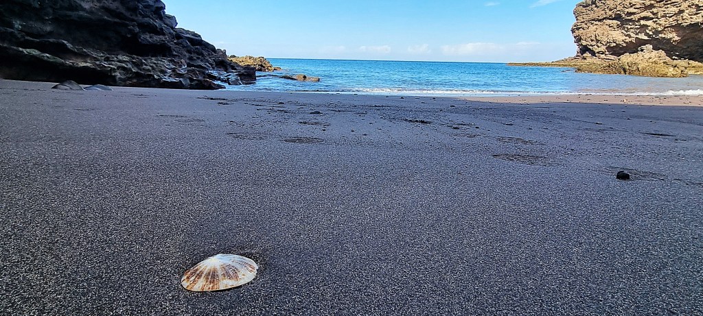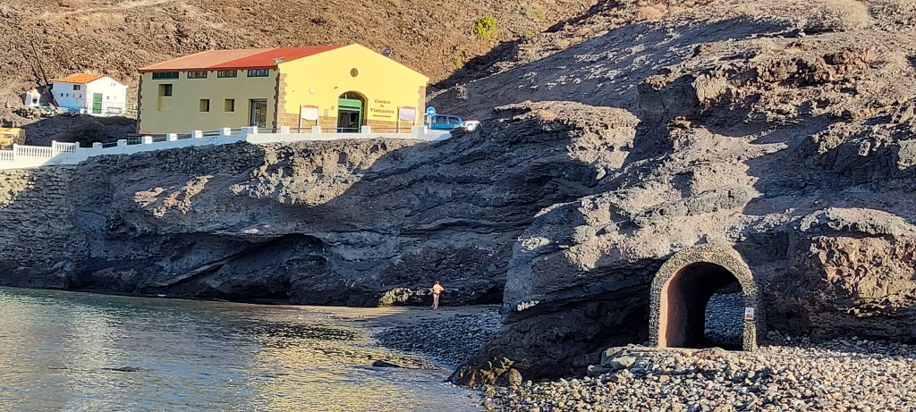 We arrived at Playa de el Puerto, accessed by a narrow, rocky ravine stretching hundreds of metres down to the sea. There is a small sandy beach, identified by a carved triangle of rock, beneath which sits a solitary, graffiti-tagged lifebelt.