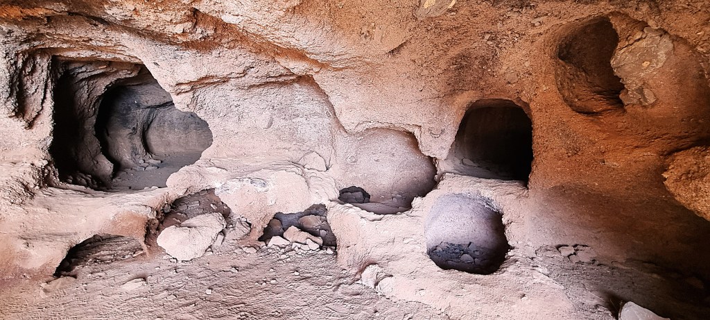 Immediately beneath Bentayga there is a cave complex used by those who maintained the site and officiated at the ceremonies. There are approximately 100 caves, including silos and burial chambers, suggesting that this site had particular prominence.