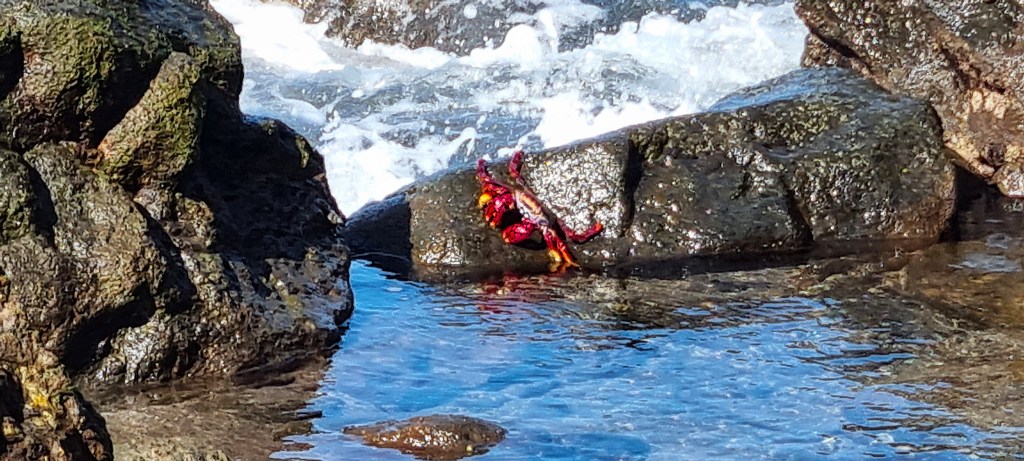 Colourful moorish red crabs (grapsus adscensionis) were squatting on the rocks. Sonia went through some yoga poses; Manu walked on his hands; we sat idly by.