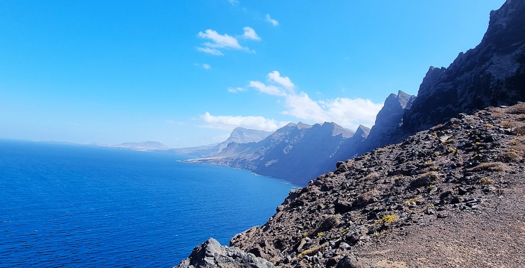 Leaving the beach behind we climbed on, round the coast, eventually reaching a viewpoint from where we could see the ‘dragon’s tail’, the jagged line of cliffs we had so often admired from Agaete. This was the Degollada de El Perchel.