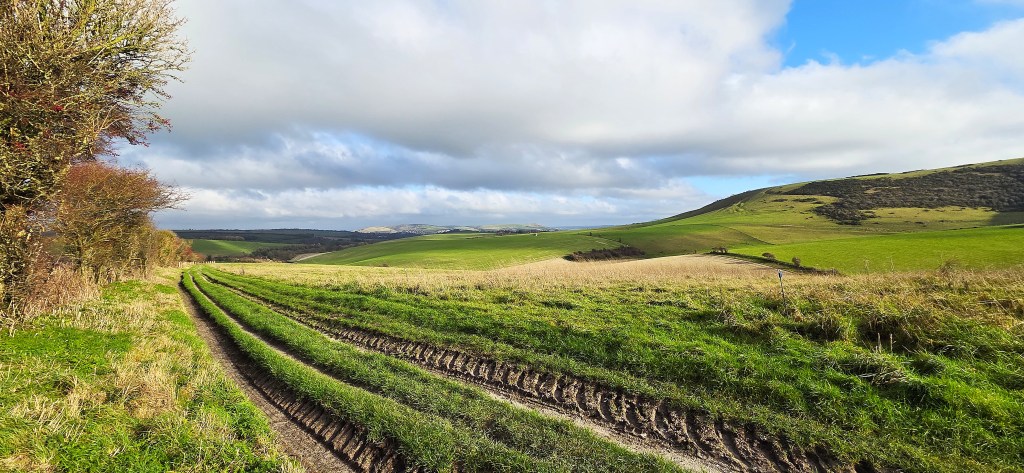 So we paused to admire the view, looking down upon Plumpton College, below, before setting off eastwards along the track.
