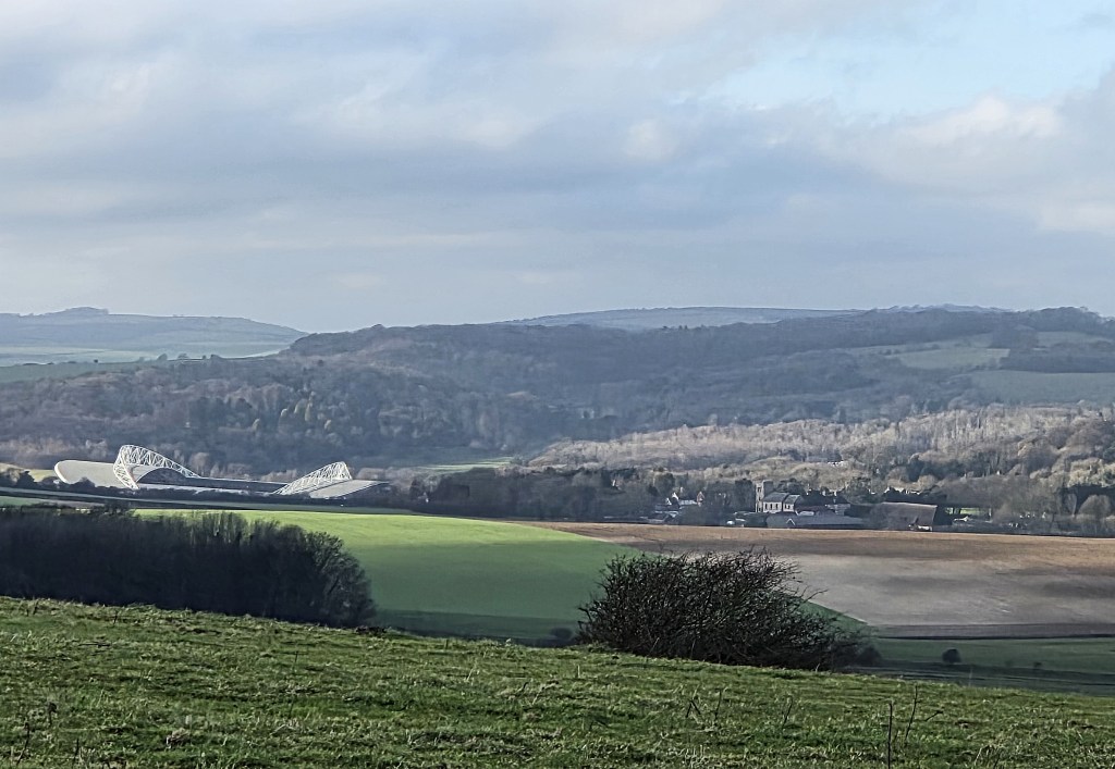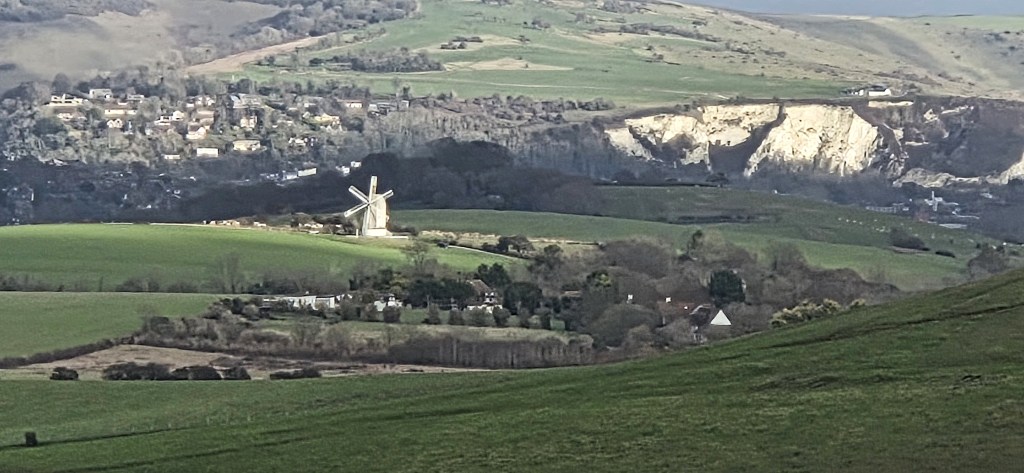 The path took a U-turn, so we were soon heading along the ridge we had been overlooking at lunch. We now had a better view of Ashcombe windmill and, in the other direction, of the American Express Stadium at Falmer, home of Brighton and Hove Albion since 2011.