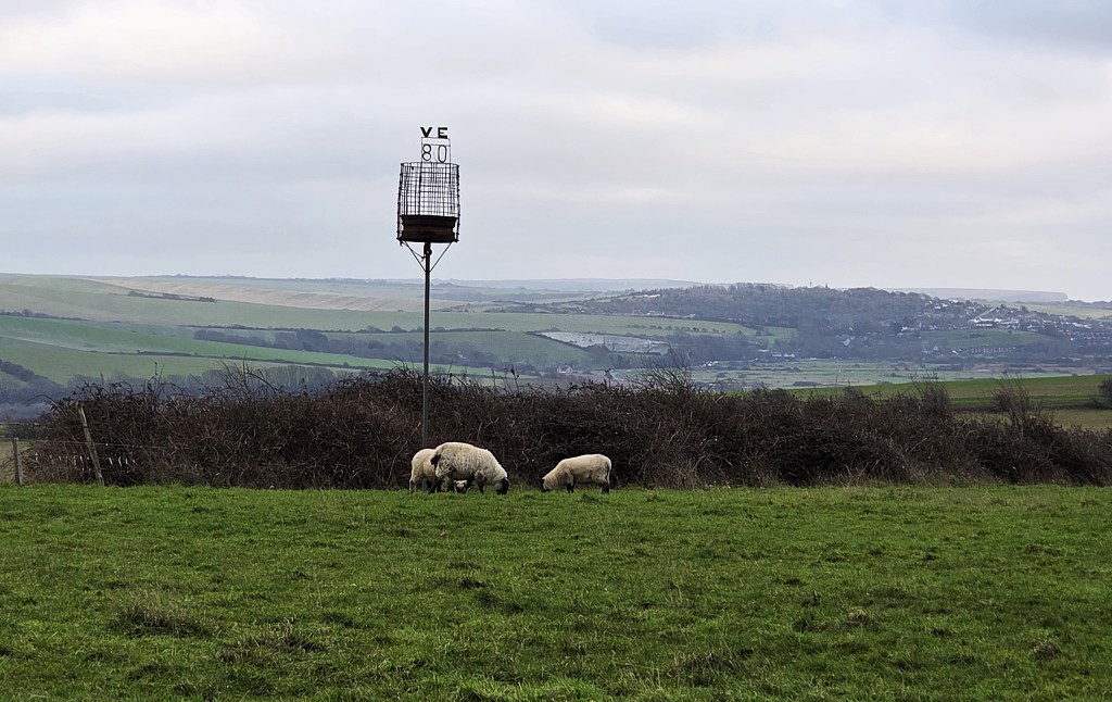 We admired the beacon, one of many erected to mark the 80th anniversary of VE Day on 8 May 2025. A trio of local sheep were grazing round about.
