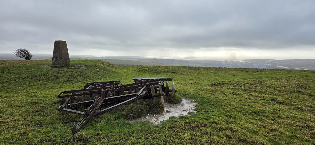 We stopped for an early coffee, sitting on a rusting vintage tractor attachment, parked next to a trig point.
