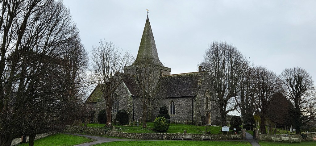 We sat on a bench overlooking West Firle. It had a dog’s lead draped over one end, platted and with a shiny pink collar. No self-respecting dog would we seen wearing that. We saw another, similar lead attached to the fence a few hundred metres further on.
