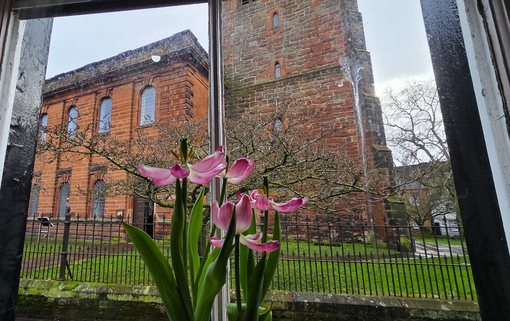 We paused mid tour to take coffee in Café Dawn Marie, adjacent to St Andrew’s Churchyard. We sat beside a window, looking out upon the Church, with a potted pink tulip in the foreground.