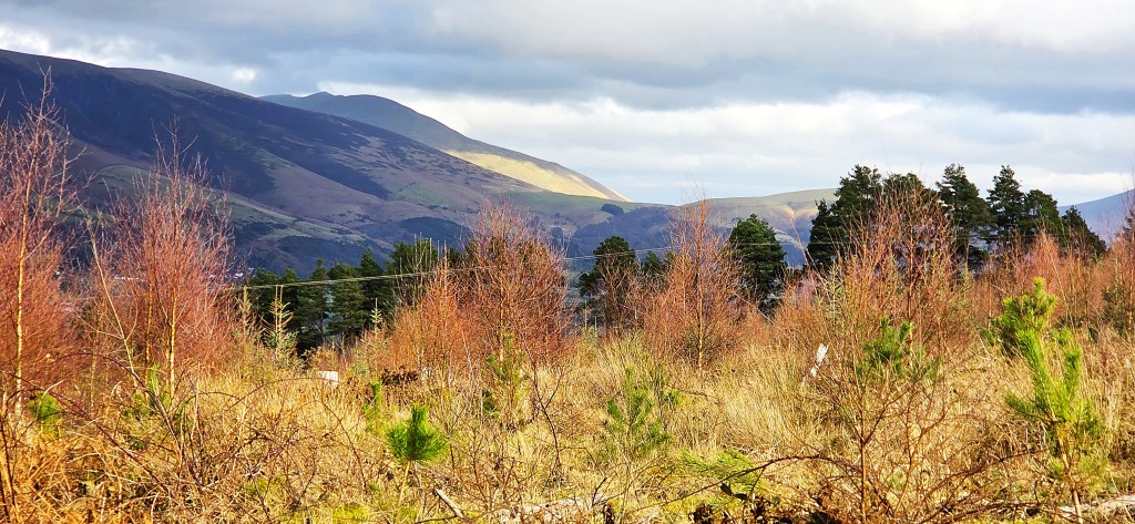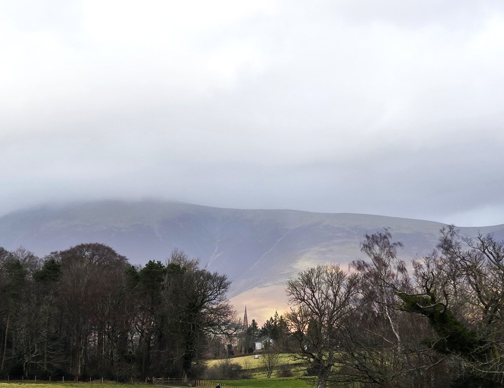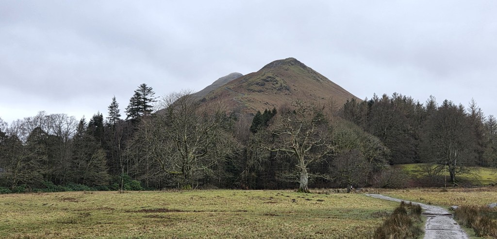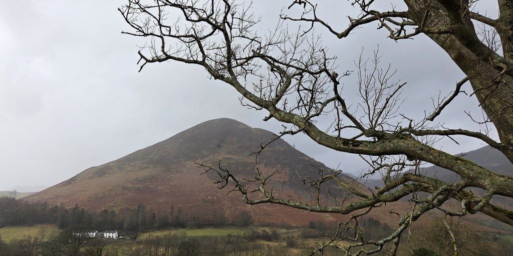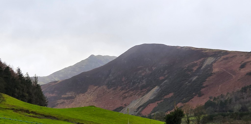 As we made our way across the fields between Portinscale and Braithwaite, the summit of Grisedale loomed above us, mostly clear of cloud. We bypassed the pleasantly named Ullock, a tiny place, not to be confused with the identical village on the way to Workington.