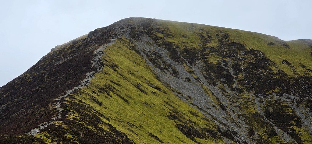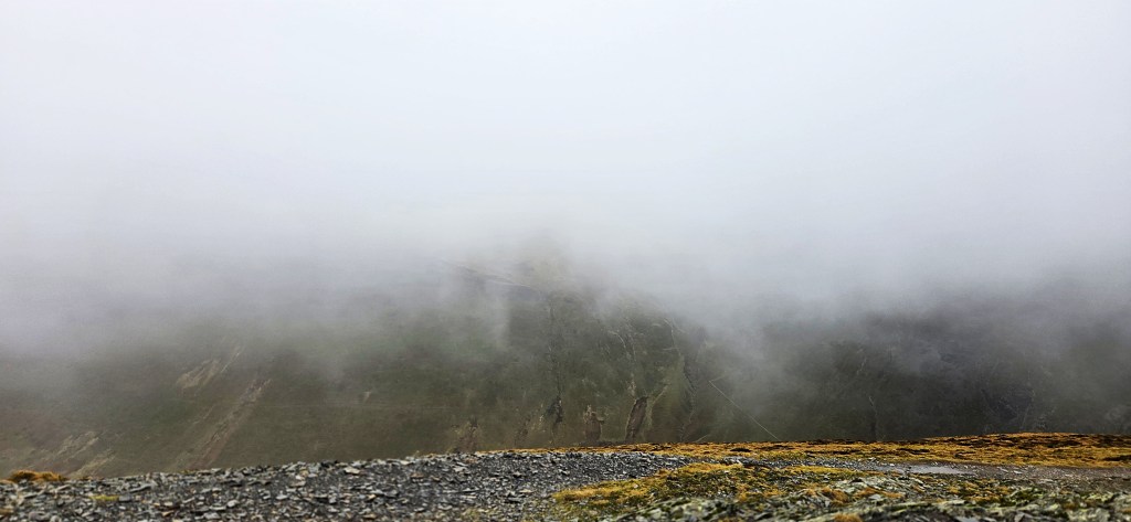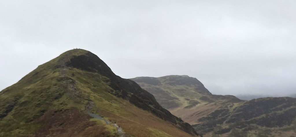 Having navigated Sleet Hause, we began the steep ascent towards the summit, occasionally buffeted by nasty gusts of wind. The wind-driven rain was discovering every tiny crevice in our waterproofs, while my sore heel was already sodden.