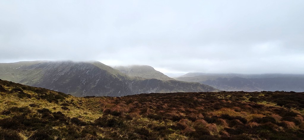 The ascent of Outerside (568 metres) was fairly straightforward, since we were sheltered from the worst of the wind. On the other hand, the descent was distinctly unpleasant with long sections of bog, narrow waterlogged paths operating as small streams, and treacherous rocky outcrops.