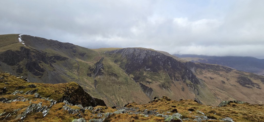 On reaching the top of this section, we stopped for a coffee break, aware that it would be the last shelter we would have against the elements for some considerable time. Braithwaite lay spread out, far below.