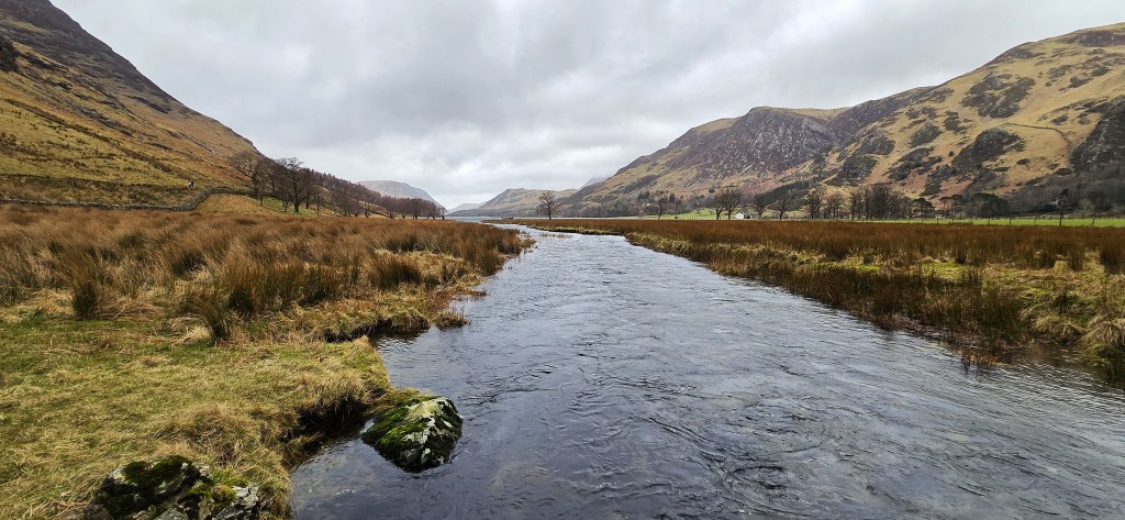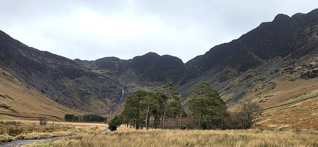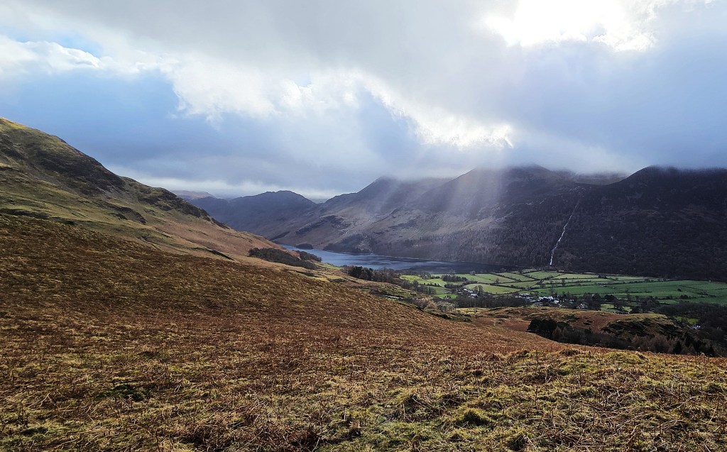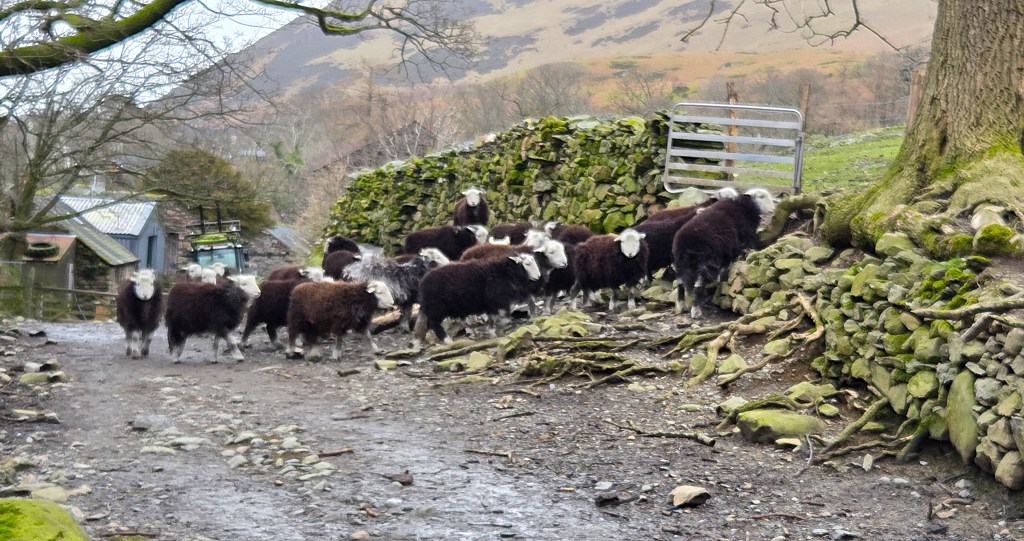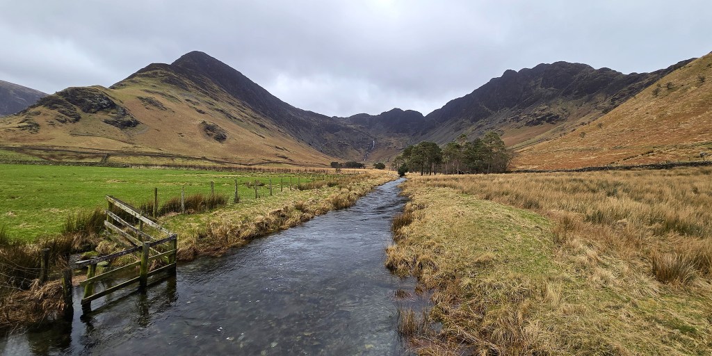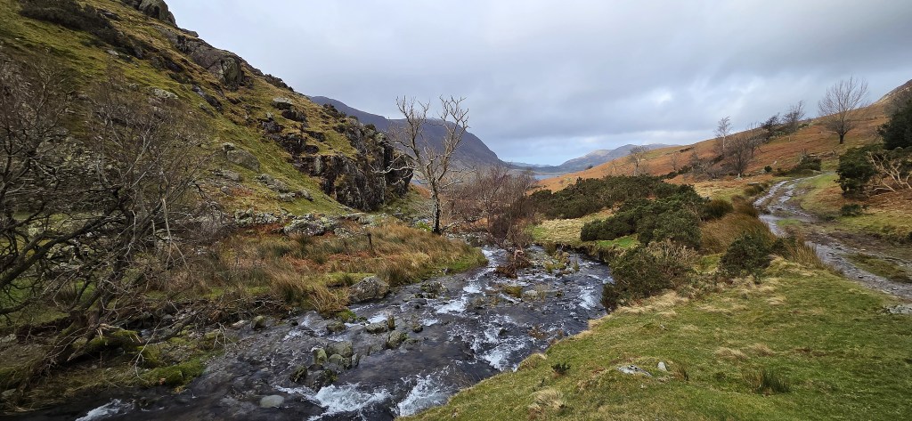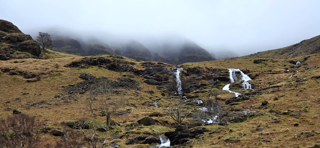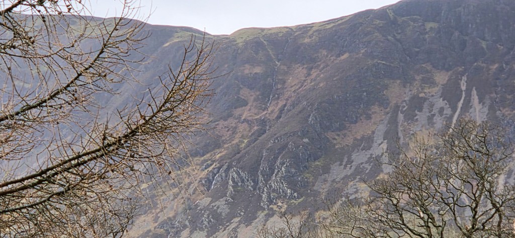 Conditions stayed relatively benign on the lower slopes, which we approached from Ghyll Bank, crossing Newlands Beck and passing close by the Rowling End Farm holiday cottages.