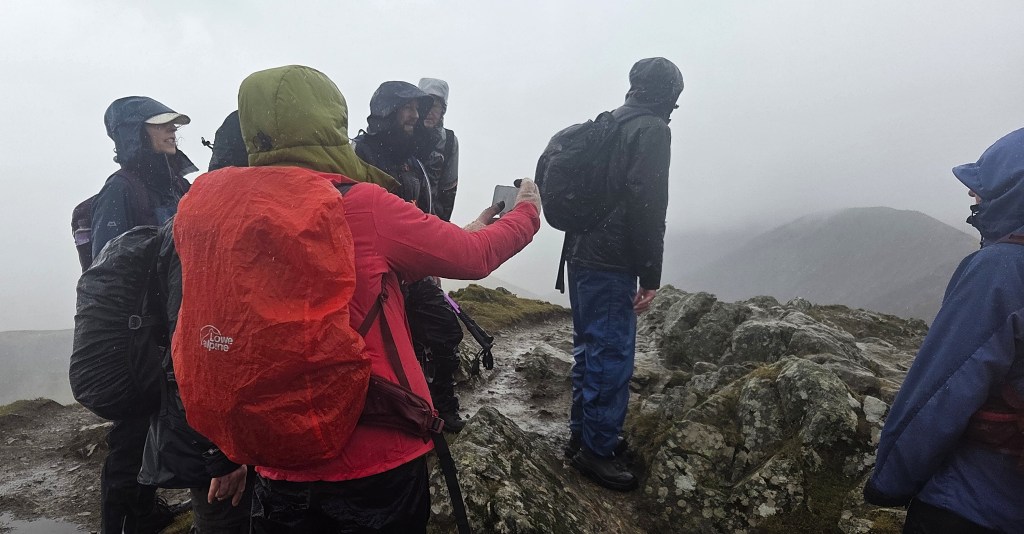 There is a substantial rocky knobble on the top of Causey Pike, often described as an easy scramble. But it is far harder in very limited visibility, while you are soaked and struggling to stay firmly upon the ground, rather than flying away; when much of the rock is rendered slippery and treacherous.