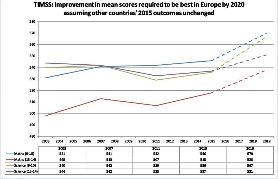 . This post reassesses Progress against the government’s national performance targets and The comparative performance of England’s high attaining pupils following publication of the TIMSS 2015 international comparisons study. . About TIMSS The results of the 2015 Trends in Maths and Science Study (TIMSS) were published at the end of November 2016. TIMSS is a … Continue reading Troubling TIMSS trends